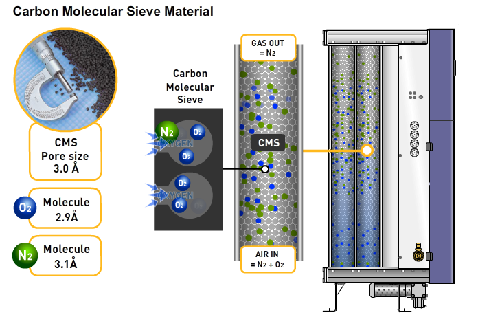 Công nghệ PSA dựa trên nguyên tắc cột lọc bằng phân tử carbon CMS sẽ hấp thụ phân tử Oxi (do phân tử Oxi có kích thước phân tử nhỏ hơn nitơ nên dễ thẩm thấu xâu vào các hạt lọc carbon) chỉ còn lại phân tử Nitơ xuyên qua cột lọc đi ra ngoài thành sản phẩm.
